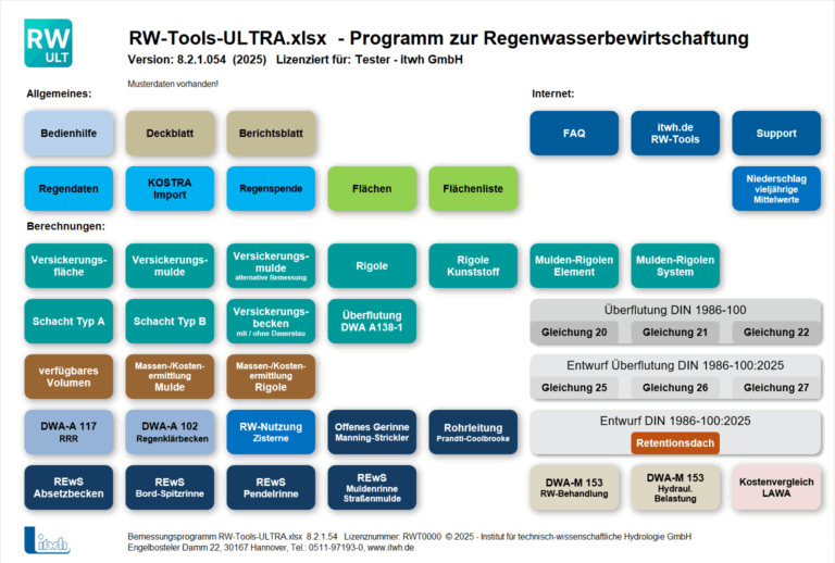Unsere neue Software RW-Tools-ULTRA.xlsx bietet ein breites Spektrum von Planungsassistenten rund um das Thema Regenwasserbewirtschaftung. Im Zentrum steht das im Oktober 2024 neu erschienene DWA-Arbeitsblatt 138 „Anlagen zur Versickerung von Niederschlagswasser – Teil 1: Planung, Bau, Betrieb“. RW-Tools-ULTRA geht jedoch weit über das Arbeitsblatt hinaus. Es bietet zahlreiche Berechnungsverfahren aus anderen DWA-Arbeitsblättern und weiteren Regelwerken.